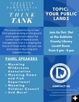 Sublette County Democratic Party will host a Think Tank on Tuesday, October 21st. The topic will be: Your Public Lands. This event will be at the Pinedale Library Lovatt Room from 6-8PM. Hear from people working on the ground and in government about the curren ... FULL STORY