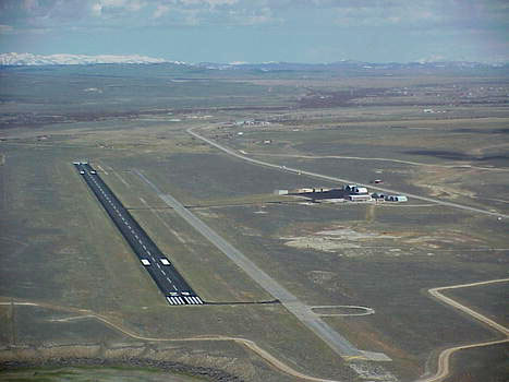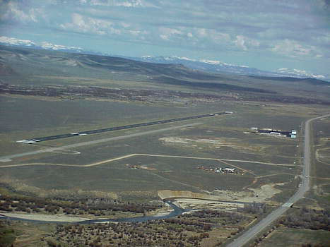 View looking west with Hwy 191 and airport buildings in foreground and airport runway in middle of screen. New Fork River and the Mesa are in the background. |