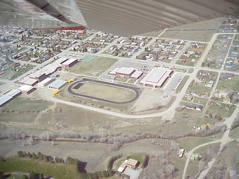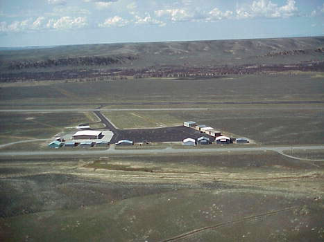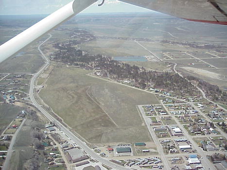 View looking north at Pinedale Wenz Field airport. Hwy. 191 is behind airport buildings in center of screen. |