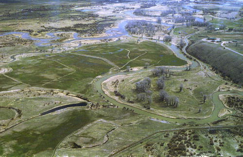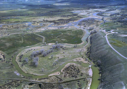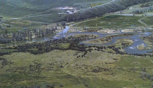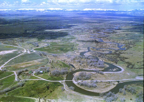 View looking southeast at confluence of Green River and Horse Creek. DeSmet Monument and Daniel Cementary on hill on right. Site of historic Green River Rendezvous. Green River flows south off top of picture. |