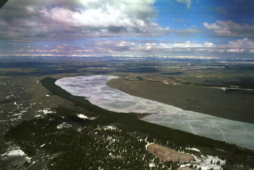 View looking west shows Half Moon Lake on the left and Fremont Lake on the right in middle of picture. Foreground shows the back side of the White Pine Ski area. |