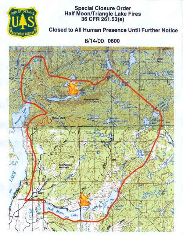 Summary: A Type II Overhead Team arrived late last night to take over the fire operation management. The Special Closure Order is still in effect for the Half Moon & Triangle Lakes fire areas. Only authorized firefighting personnel are allowed into the area. Visitors are being evacuated as they are encountered. Two 20-man fire crews arrived yesterday to help on the ground with the Half Moon fire. Closure Map - Revised 8/14/00