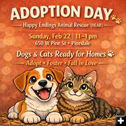 Happy Endings Animal Rescue (HEAR) will hold an Adoption Day on Sunday, February 22nd from 11AM-1PM at their location at 650 W Pine St. They will have dogs and cats ready for homes. Adopt, foster, or fall in love.