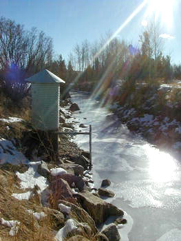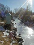 Looking upstream on Pine Creek standing on Harmony footbridge in the Pinedale Town Park, mid-January, 2000. |